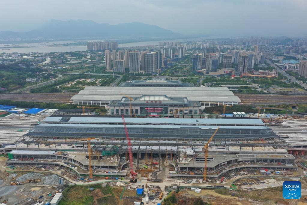 Aerial photo taken on Sept. 1, 2022 shows the construction site of the Fuzhou south railway station, a part of the Fuzhou-Xiamen high-speed railway, in Fuzhou City of southeast China's Fujian Province. With a designed speed of 350 km per hour, the 277-km Fuzhou-Xiamen high-speed railway is expected to slash the travel time from the province's capital Fuzhou to the tourist attraction Xiamen within one hour. (Xinhua/Lin Shanchuan)