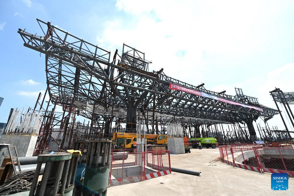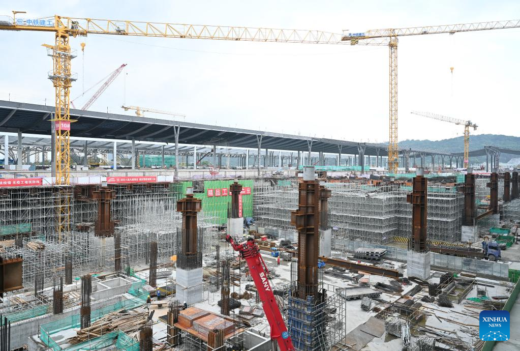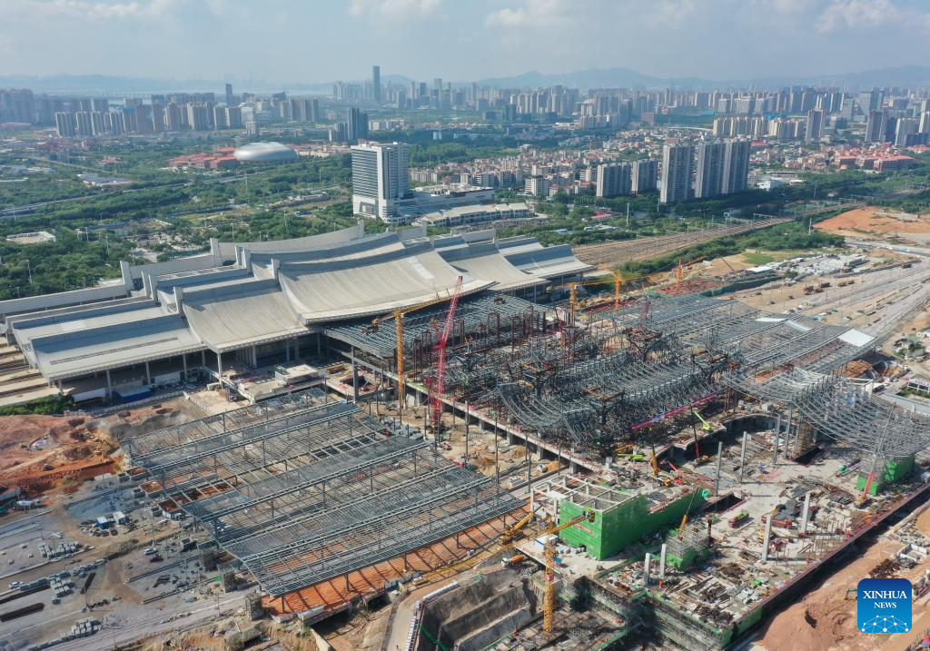 Photo taken on Sept. 1, 2022 shows the construction site of the Fuzhou south railway station, a part of the Fuzhou-Xiamen high-speed railway, in Fuzhou City of southeast China's Fujian Province. With a designed speed of 350 km per hour, the 277-km Fuzhou-Xiamen high-speed railway is expected to slash the travel time from the province's capital Fuzhou to the tourist attraction Xiamen within one hour. (Xinhua/Lin Shanchuan)