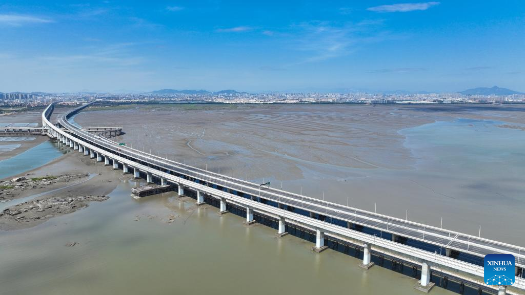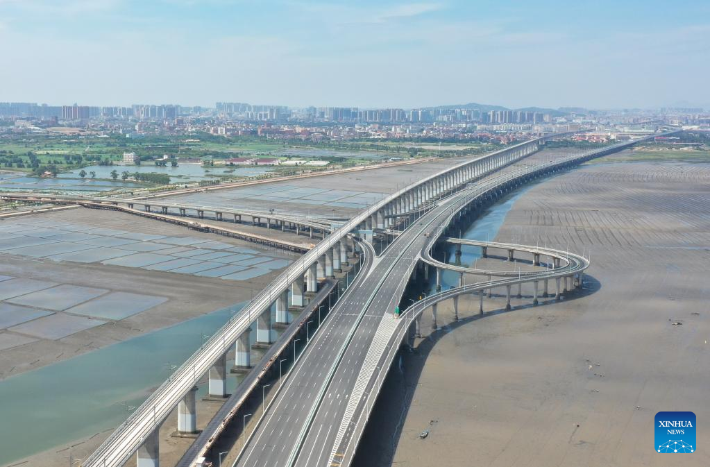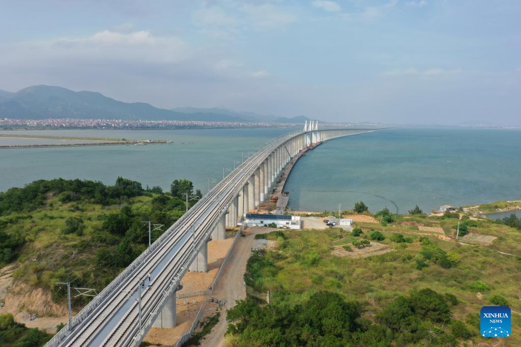 Aerial photo taken on Sept. 2, 2022 shows the Quanzhou Bay cross-sea bridge, a part of the Fuzhou-Xiamen high-speed railway, in southeast China's Fujian Province. With a designed speed of 350 km per hour, the 277-km Fuzhou-Xiamen high-speed railway is expected to slash the travel time from the province's capital Fuzhou to the tourist attraction Xiamen within one hour. (Xinhua/Lin Shanchuan)