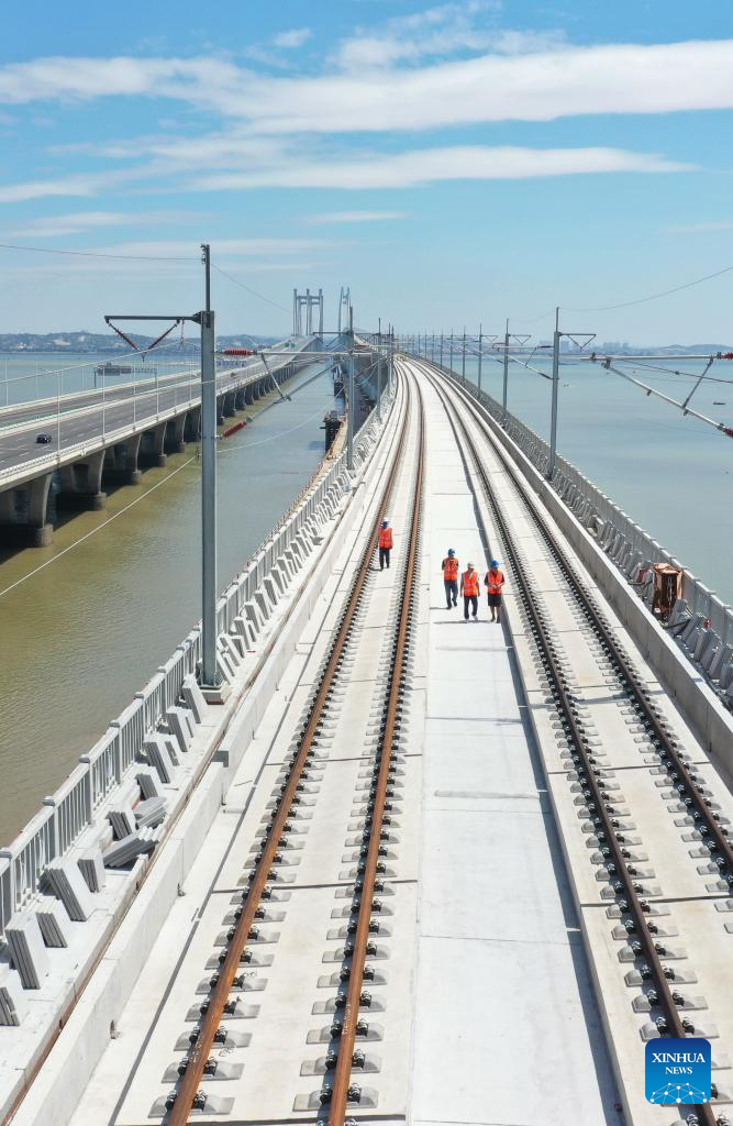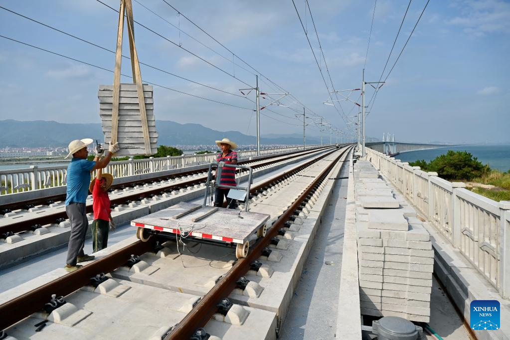 Workers operate at the Meizhou Bay cross-sea bridge, a part of the Fuzhou-Xiamen high-speed railway, in southeast China's Fujian Province, Sept. 1, 2022. With a designed speed of 350 km per hour, the 277-km Fuzhou-Xiamen high-speed railway is expected to slash the travel time from the province's capital Fuzhou to the tourist attraction Xiamen within one hour. (Xinhua/Lin Shanchuan)
