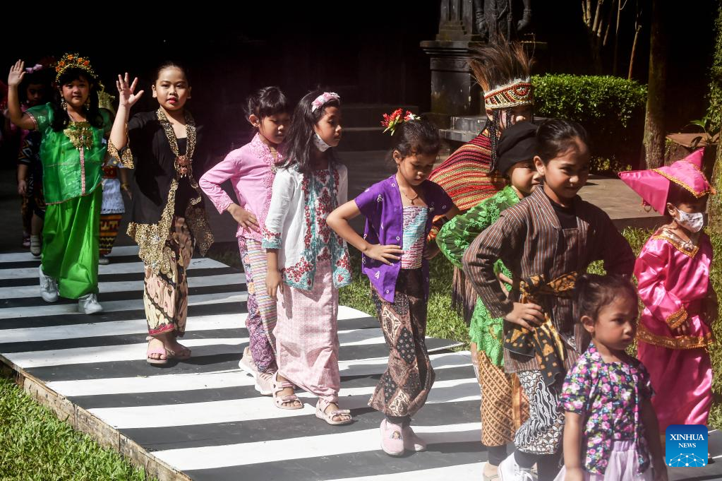 Children dressed in Kebaya, a traditional Indonesian costume, take part in a fashion show held at Rumah Budaya Nusantara Puspo Budoyo in South Tangerang, Banten Province, Indonesia, Sept. 4, 2022. (Xinhua/Agung Kuncahya B.)