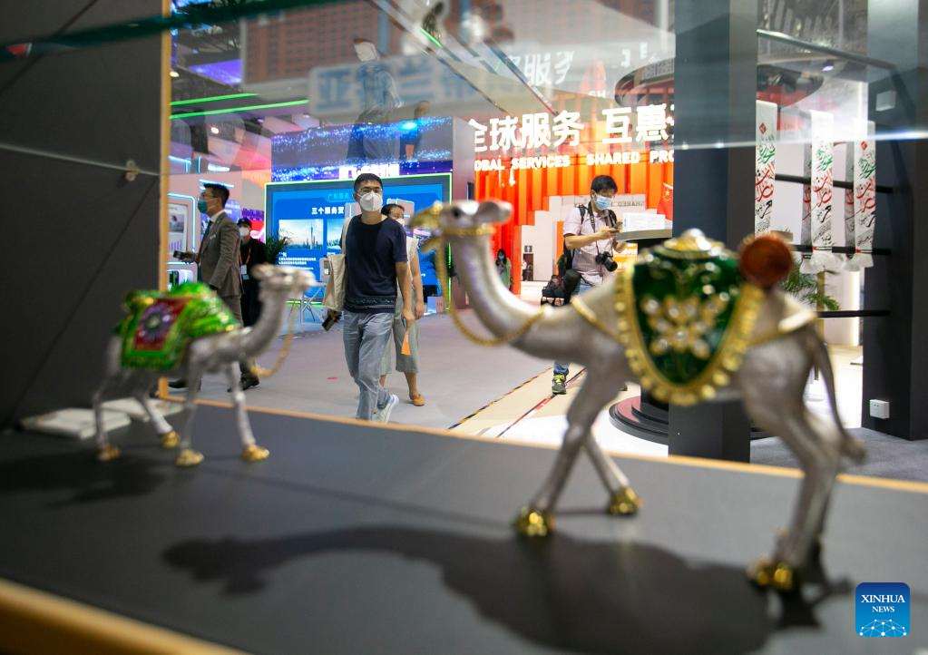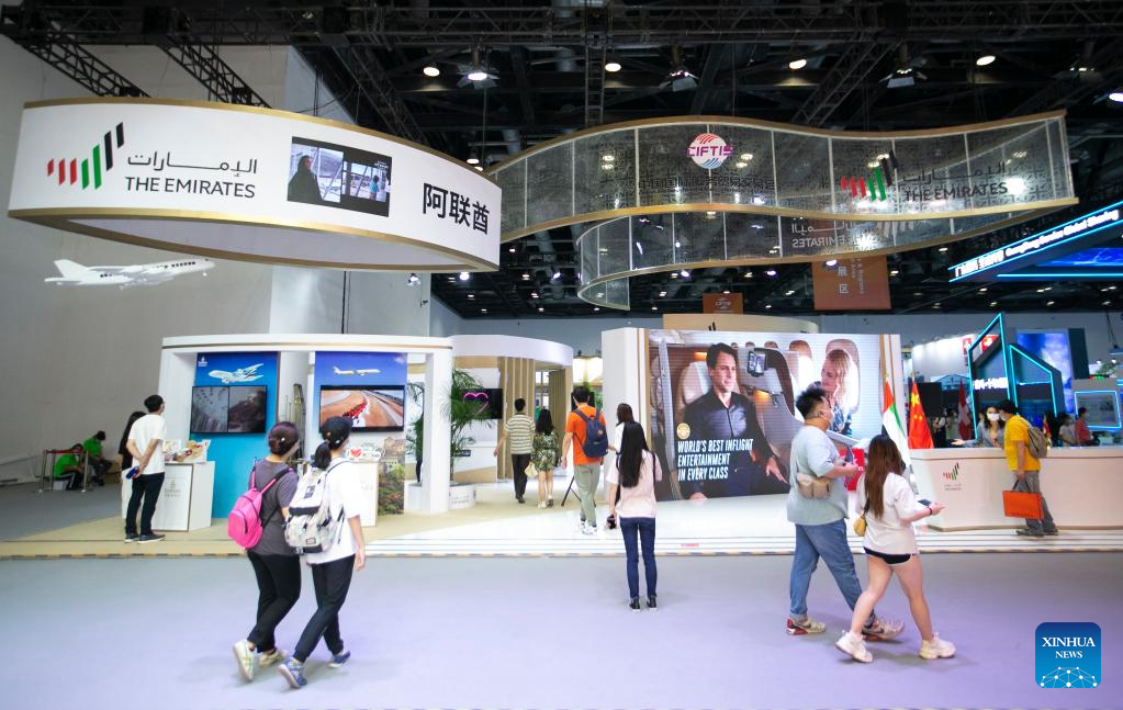 People visit the booth of the United Arab Emirates (UAE) at the China National Convention Center during the 2022 China International Fair for Trade in Services (CIFTIS) in Beijing, capital of China, Sept. 3, 2022. (Xinhua/Zhang Fan)