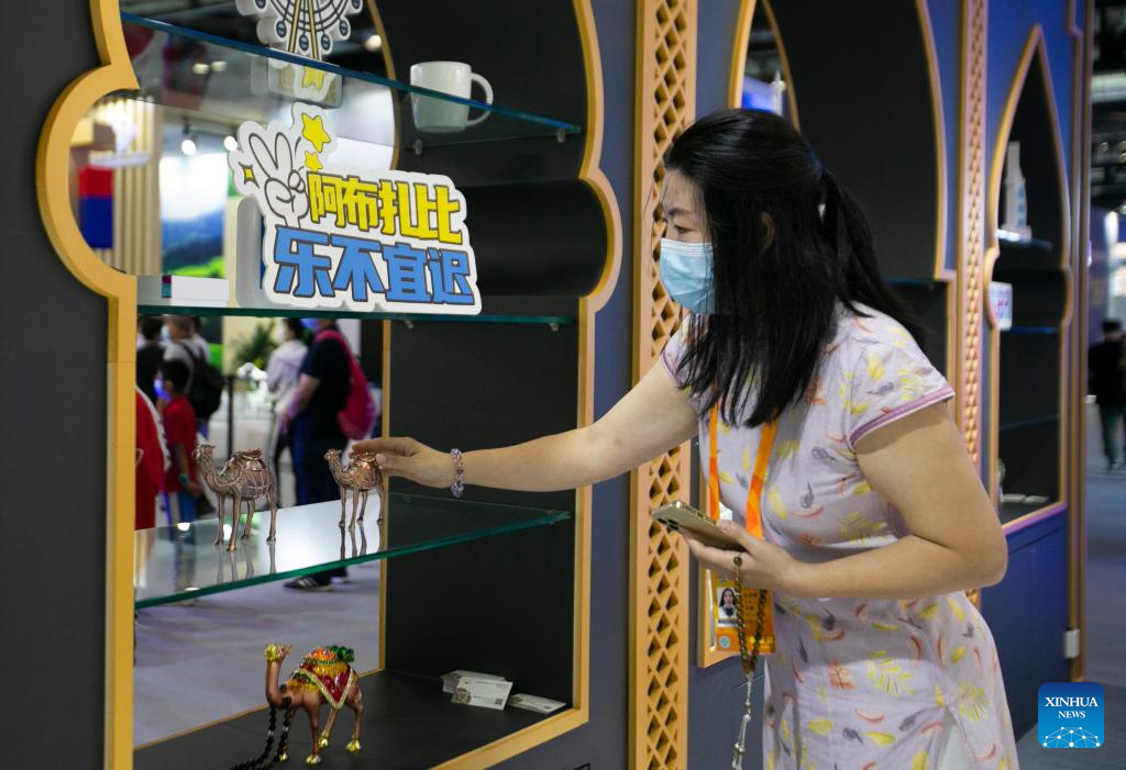 A woman visits the booth of the United Arab Emirates (UAE) at the China National Convention Center during the 2022 China International Fair for Trade in Services (CIFTIS) in Beijing, capital of China, Sept. 3, 2022. (Xinhua/Zhang Fan)