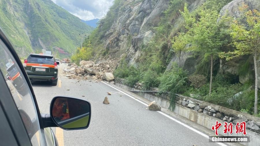 A damaged road by rock slide is seen on a highway at quake-hit Luding county, Ganzi Tibetan autonomous prefecture, southwest China's Sichuan Province after a 6.8-magnitude earthquake jolted Luding county, Sept. 5, 2022. (Photo provided to China News Service)