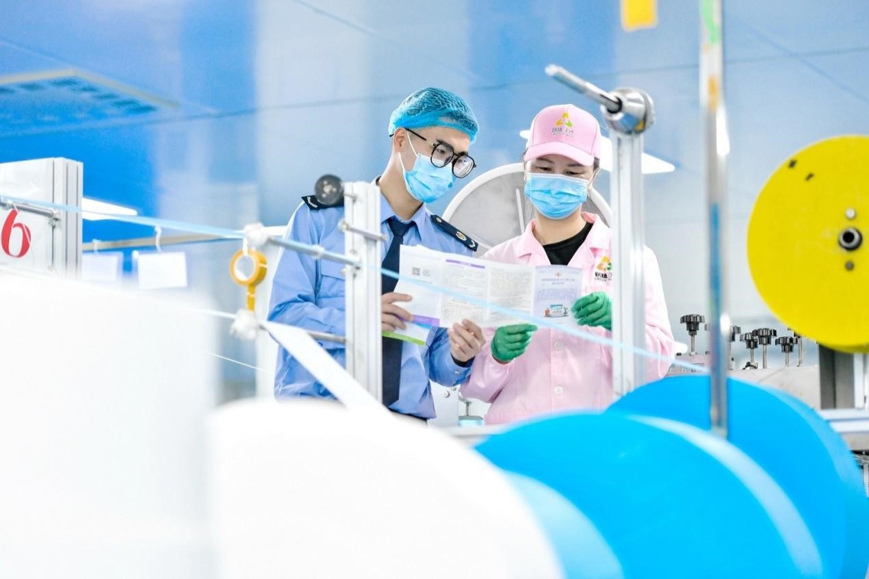 A staff member of the tax office of Heping township, Changxing county, Huzhou city, east China's Zhejiang province, explains China's new package of tax-and-fee policies designed to support enterprises to an employee of a local manufacturer of anti-epidemic materials, May 2022. (People's Daily Online/Tan Yunfeng)