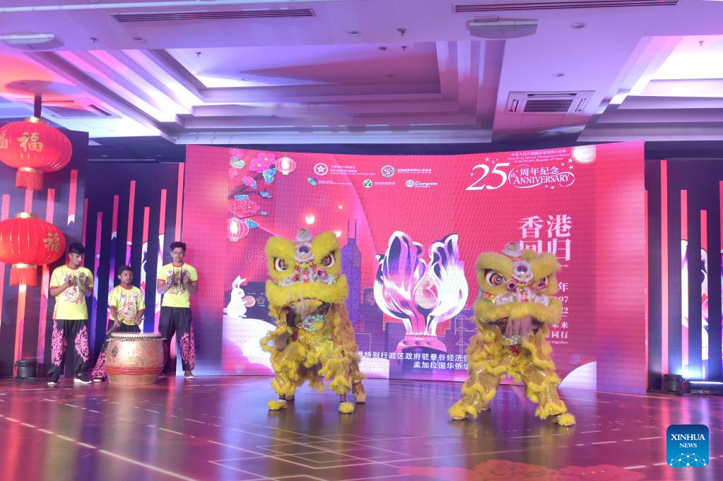 People perform lion dance at a reception celebrating the 25th anniversary of the return of Hong Kong to the motherland in Dhaka, Bangladesh, Sept. 2, 2022. (Xinhua)