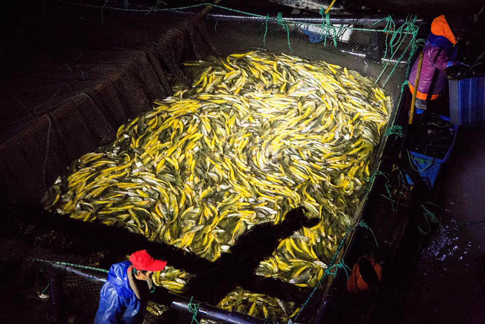 Workers harvest large yellow croakers with a huge fishing net. (Photo courtesy of the interviewee)