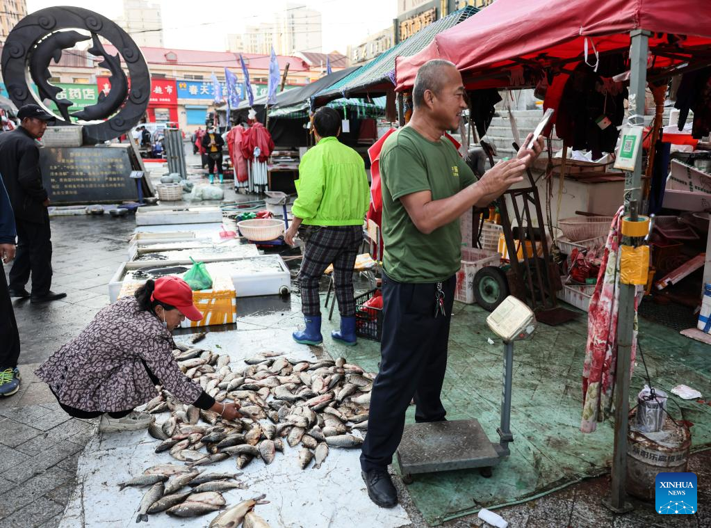 Citizens buy fish with mobile phone via QR code payment service at Dongji fish market, literally means the easternmost fish market, in Fuyuan City, northeast China's Heilongjiang Province, Sept. 4, 2022.
