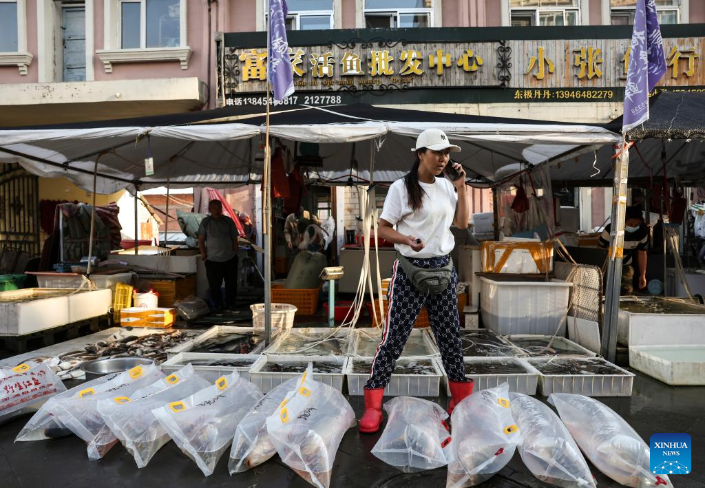 A vendor talks with customer by mobile phone at Dongji fish market, literally means the easternmost fish market, in Fuyuan City, northeast China's Heilongjiang Province, Sept. 4, 2022.