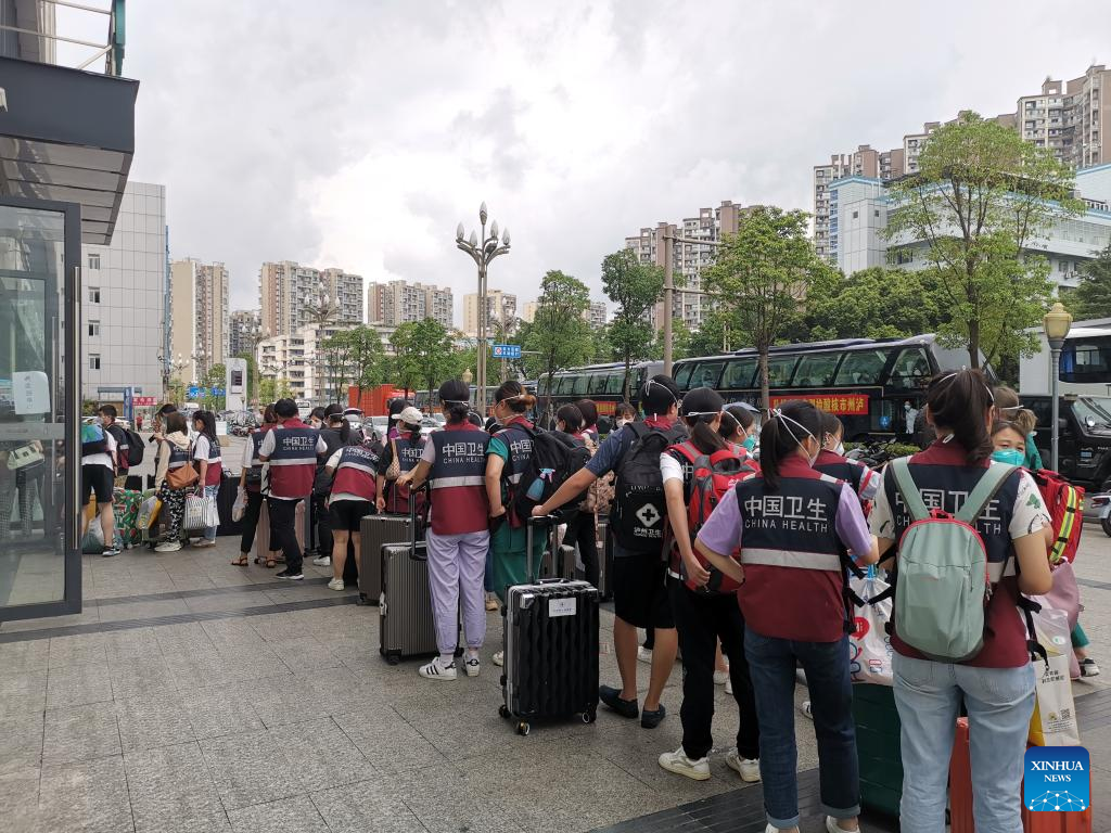 Medical workers from the city of Luzhou in southwest China's Sichuan Province arrive to assist in COVID-19 nucleic acid testing in the provincial capital Chengdu on Sept. 2, 2022.