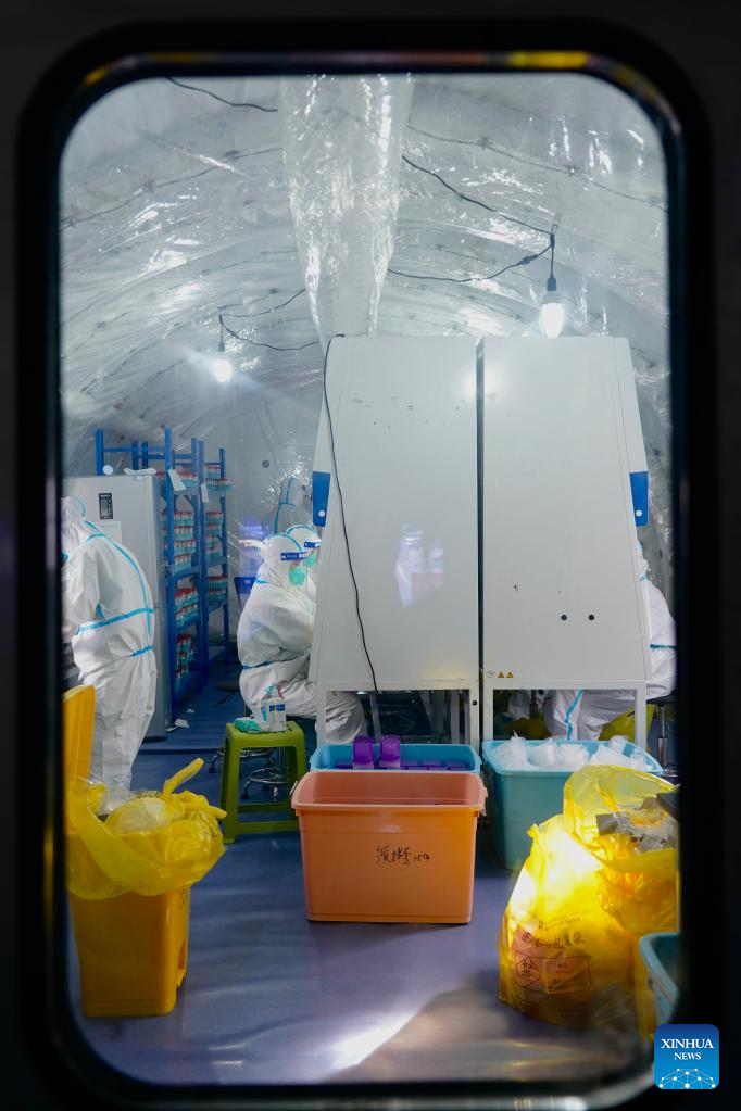 Medical workers work in an air-inflated testing lab in Chengdu, southwest China's Sichuan Province, Sept. 5, 2022.