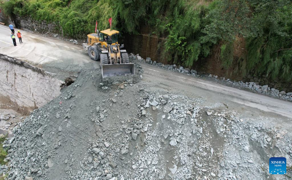 A worker removes a rock from the S217 provincial highway after an earthquake in Luding County of southwest China's Sichuan Province, on Sept. 6, 2022. A 6.8-magnitude earthquake jolted Luding County on Monday. Rescuers have been organized to restore and maintain damaged road access. (Xinhua)