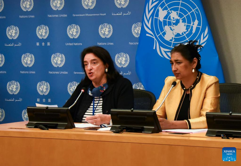 Maria-Francesca Spatolisano (L), Assistant Secretary-General for Policy Coordination and Inter-Agency Affairs of the UN Department of Economic and Social Affairs (UN DESA), briefs on the "Gender Snapshot," at the UN headquarters in New York, Sept. 7, 2022. (Xinhua/Wang Jiangang)
