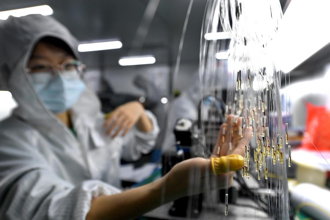 Employees of Wuhan ETERN Optoelectronics Technology Co., Ltd. based in the East Lake High-tech Development Zone, Wuhan, central China's Hubei province, work on a production line, March 25, 2022. (People's Daily Online/Zhou Chao)