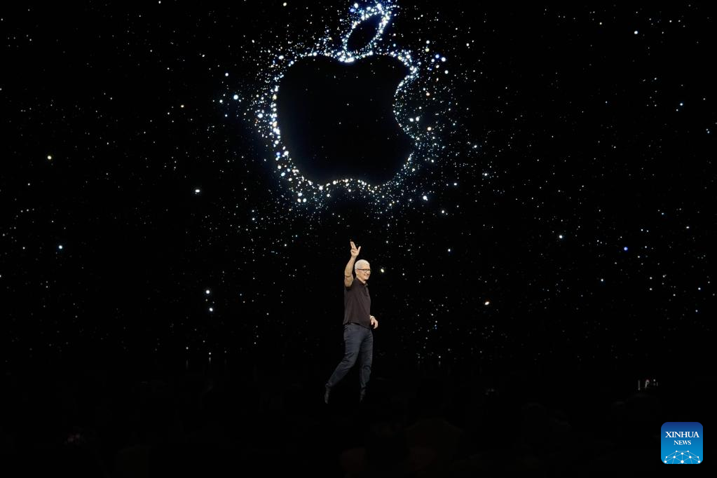 Apple CEO Tim Cook attends a product launch event in San Francisco Bay Area, California, the United States, Sept. 7, 2022. Apple on Wednesday announced new products during a product launch event held in the Steve Jobs Theater. (Xinhua)