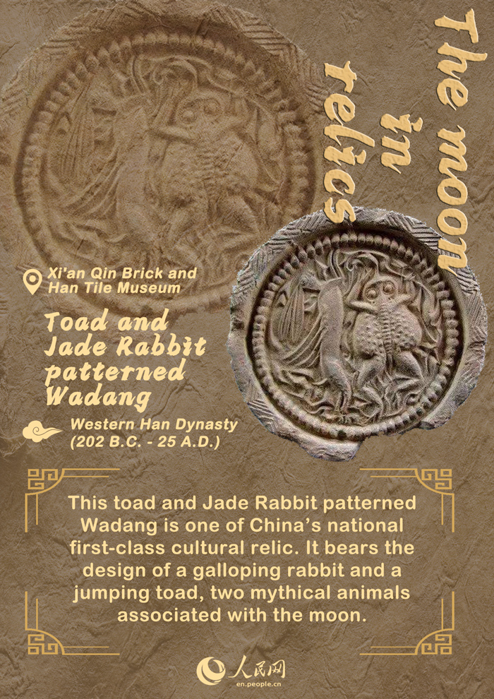 In ancient Chinese architecture, Wadang was a kind of eaves tile that shielded the eaves of buildings and architectural accessories decorating houses. This toad and Jade Rabbit patterned Wadang is one of China’s national first-class cultural relic. With a diameter of 22 centimeters on its frontside, this Wadang is a rare giant among Han tiles. It bears the design of a galloping rabbit and a jumping toad, two mythical animals associated with the moon.