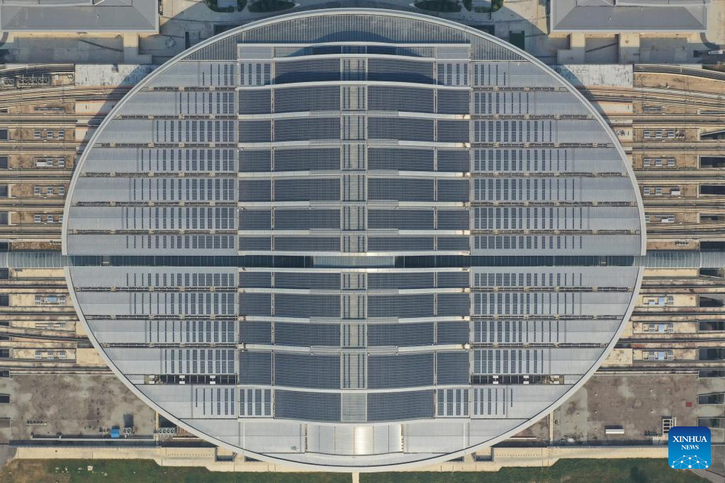 Aerial photo taken on Sept. 9, 2022 shows a distributed photovoltaic (PV) power station on the rooftop of the Xiong'an Railway Station in Xiong'an New Area, north China's Hebei Province. (Xinhua/Xing Guangli)