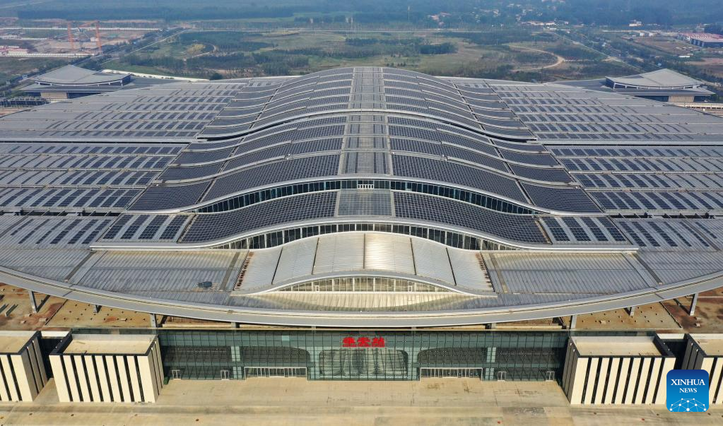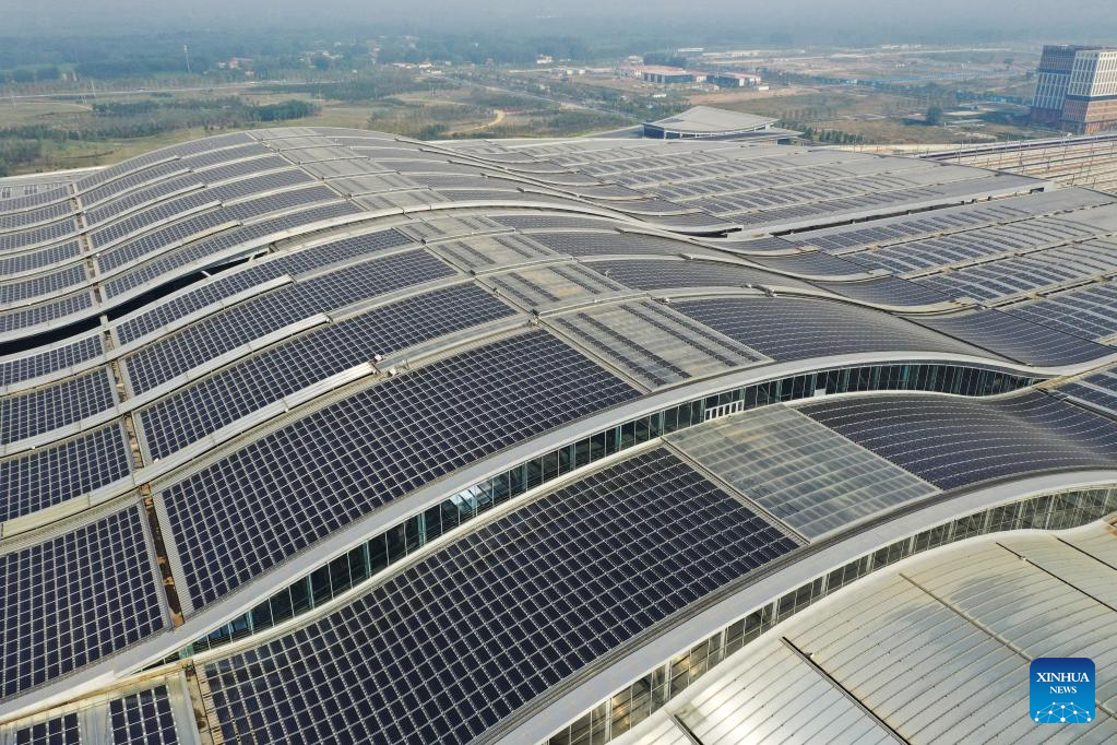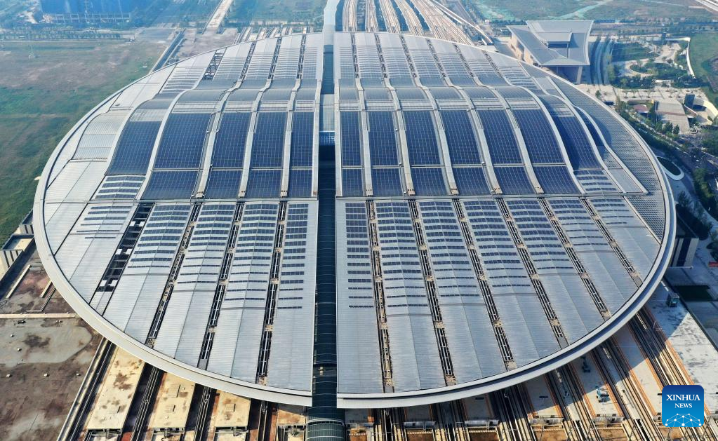 Aerial photo taken on Sept. 9, 2022 shows a distributed photovoltaic (PV) power station on the rooftop of the Xiong'an Railway Station in Xiong'an New Area, north China's Hebei Province. (Xinhua/Zhu Xudong)