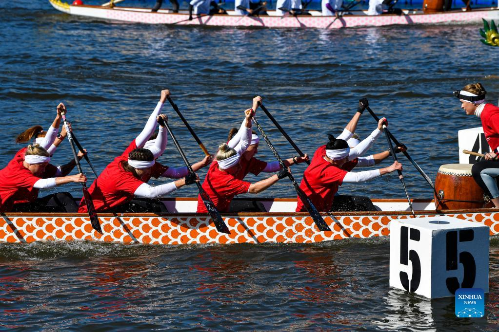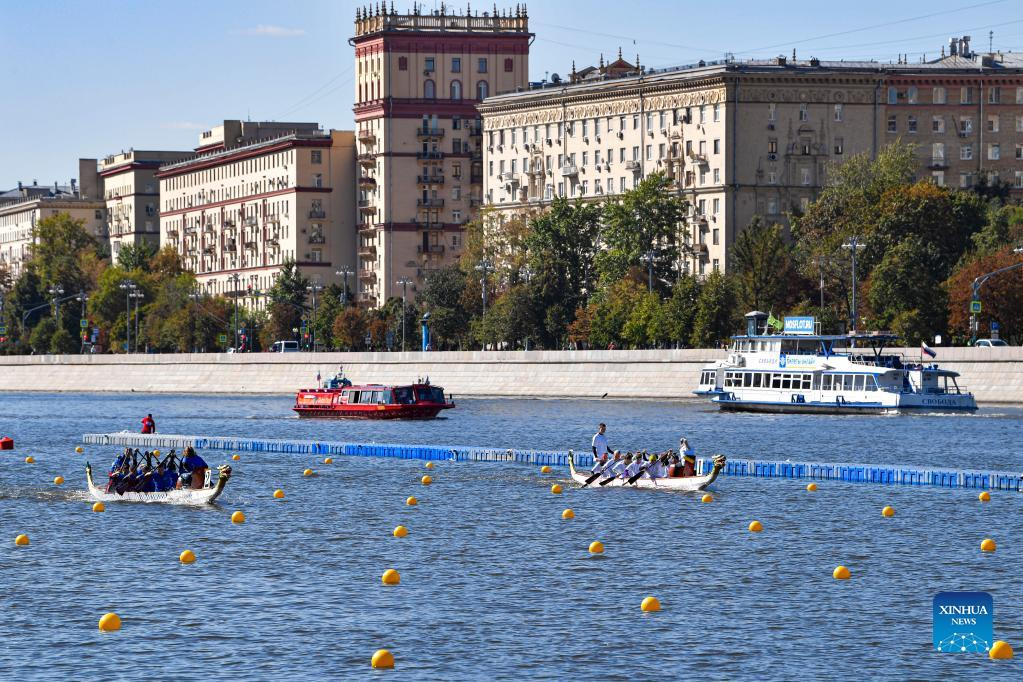 Athletes take part in a dragon boat event during Moscow City Day celebrations in Moscow, Russia, Sept. 10, 2022. A series of events were held on Saturday to celebrate Moscow City Day, marking the city's 875th founding anniversary. (Photo by Alexander Zemlianichenko Jr/Xinhua)