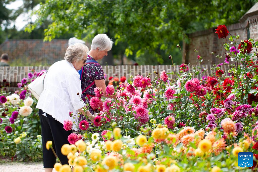 Visitors enjoy dahlia flowers at the Keukenhof Castle in Lisse, the Netherlands, on Sept. 11, 2022. (Photo by Sylvia Lederer/Xinhua)