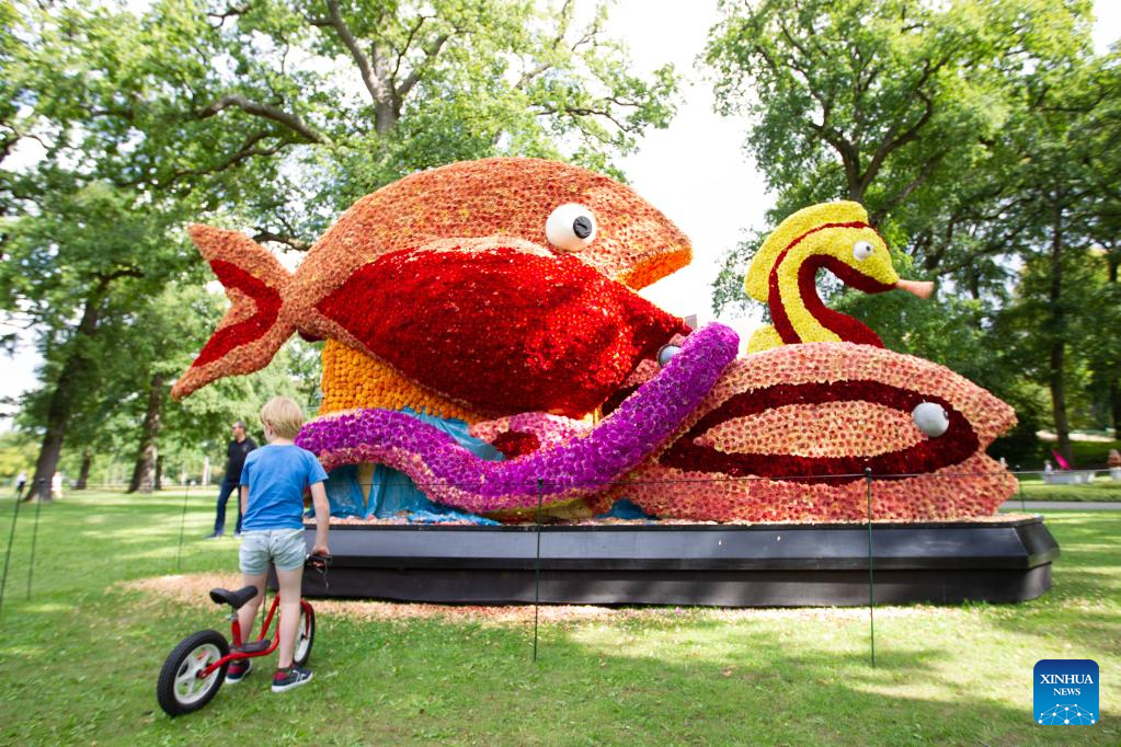 Children view a flower float of dahlia at the Keukenhof Castle in Lisse, the Netherlands, on Sept. 11, 2022. (Photo by Sylvia Lederer/Xinhua)