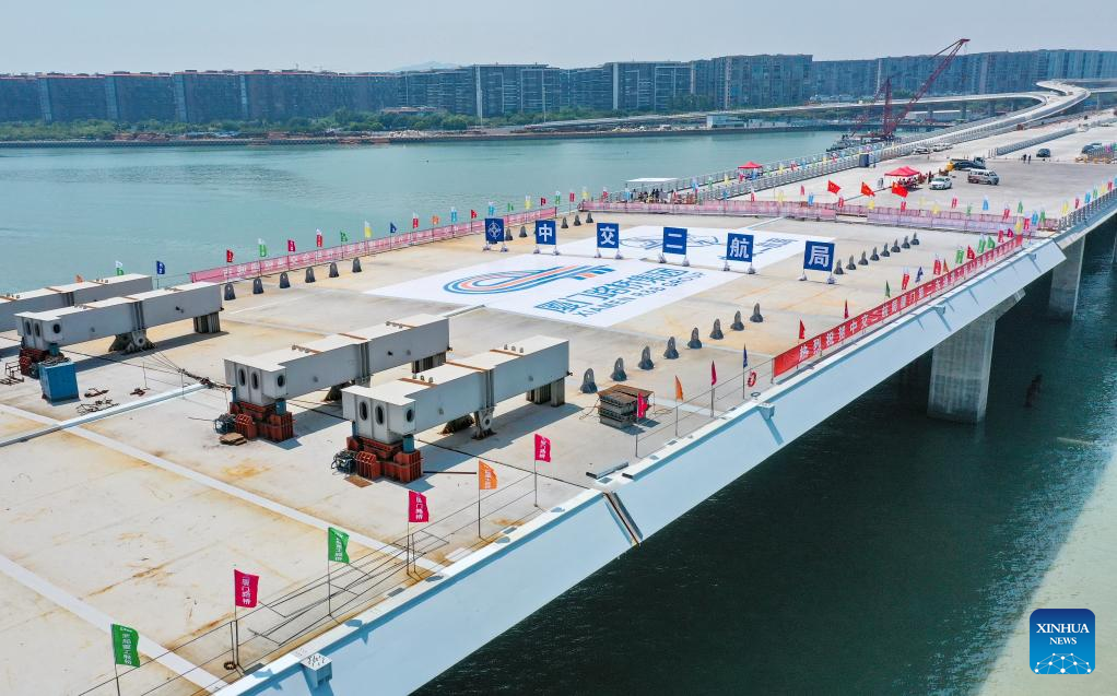 Photo taken on Sept. 12, 2022 shows the construction site of the Xiang'an Bridge during its closure in Xiamen, southeast China's Fujian Province. The bridge finished its final stage for closure on Monday. This 12-kilometer highway bridge, which consists of a 4.5-kilometer section across the sea, has a designed passing speed of 80 kilometers per hour upon completion. (Xinhua)