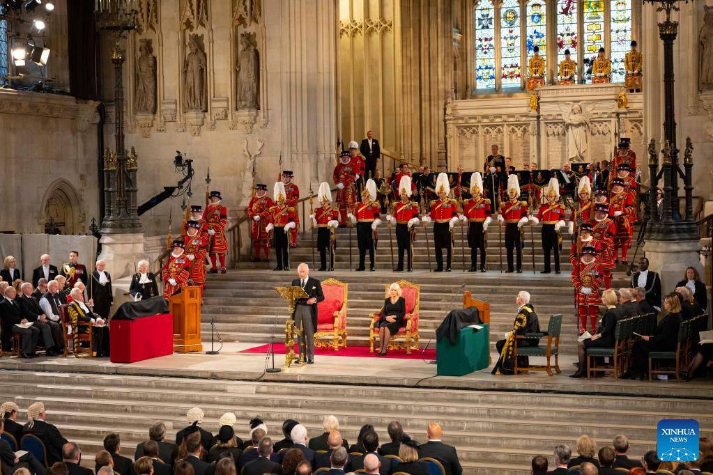 Britain's King Charles III (C) delivers his first address to the parliament in Westminster Hall in London, Britain, Sept. 12, 2022. Britain's King Charles III said he felt "the weight of history" and vowed to follow the example set by his late mother, Queen Elizabeth II, in his first address to the parliament on Monday. (Roger Harris/UK Parliament/Handout via Xinhua)