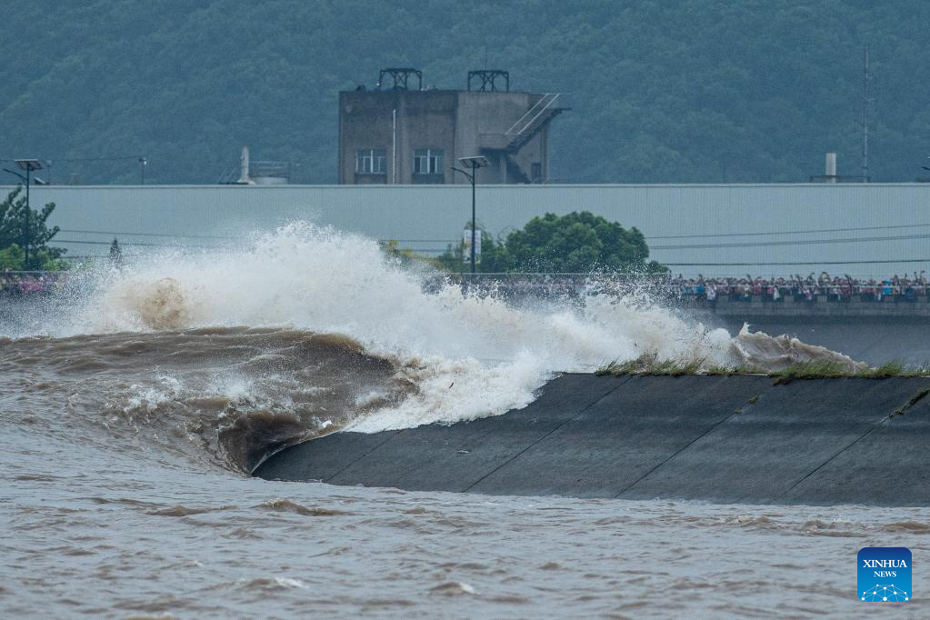 Billows are seen as a tidal bore hits banks of the Qiantang River in Hangzhou, east China's Zhejiang Province, on Sept. 13, 2022. The Qiantang River tidal bore, famous for its height and speed, is a traditional tourist attraction here. (Xinhua/Jiang Han)