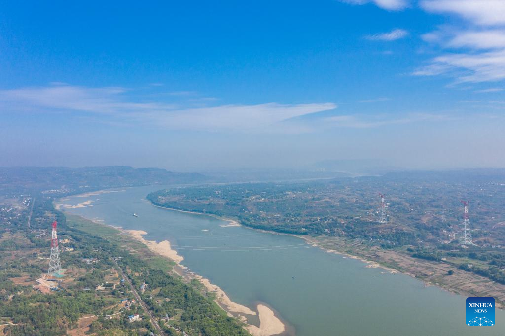 Aerial photo taken on Sept. 13, 2022 shows a scene during the cross-Yangtze River wiring operation for the Baihetan-Zhejiang 800 kv ultra-high voltage direct current (UHVDC) transmission line project (Chongqing section) in southwest China's Chongqing. After a 13-day campaign, the cross-Yangtze River wiring operation for the Baihetan-Zhejiang 800 kv ultra-high voltage direct current (UHVDC) transmission line project concluded successfully on Tuesday. The 2,140-kilometer line, whose construction kicked off in October 2021, winds its way through Sichuan, Chongqing, Hubei, Anhui and Zhejiang. It is expected to be fully built by the end of September, and operational by November this year. Celebrated as one of China's "power highways," this line is also an important part of the country's west-to-east power transmission program. (Xinhua/Huang Wei)
