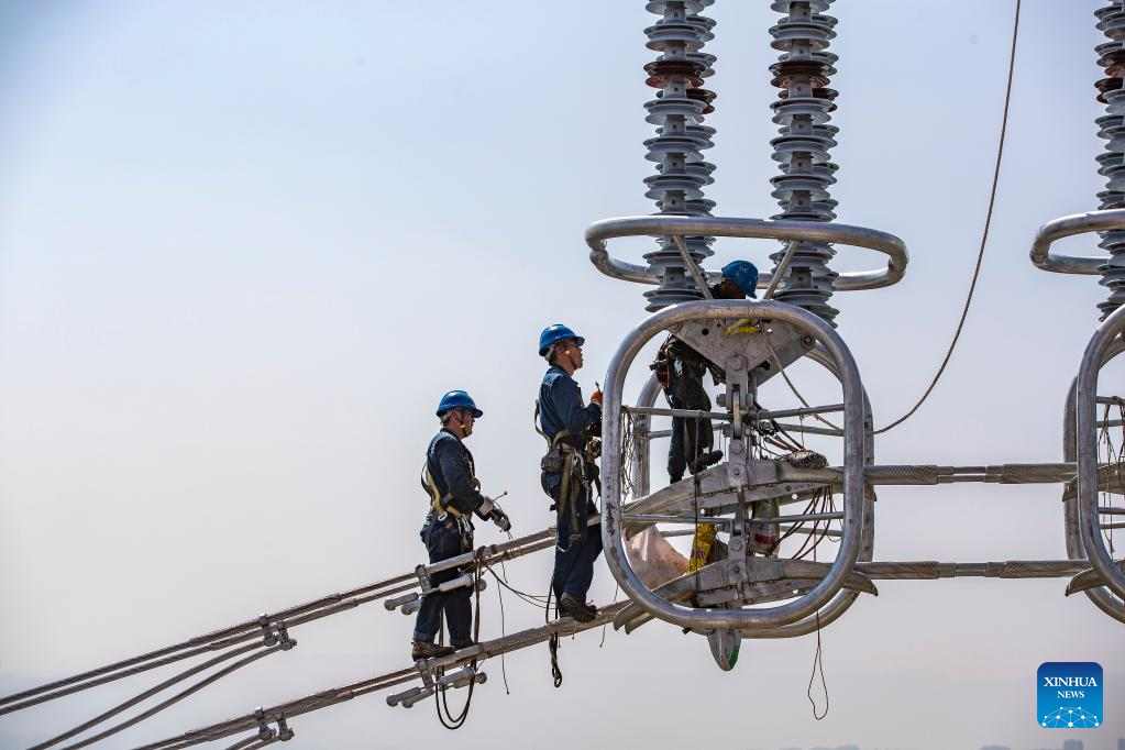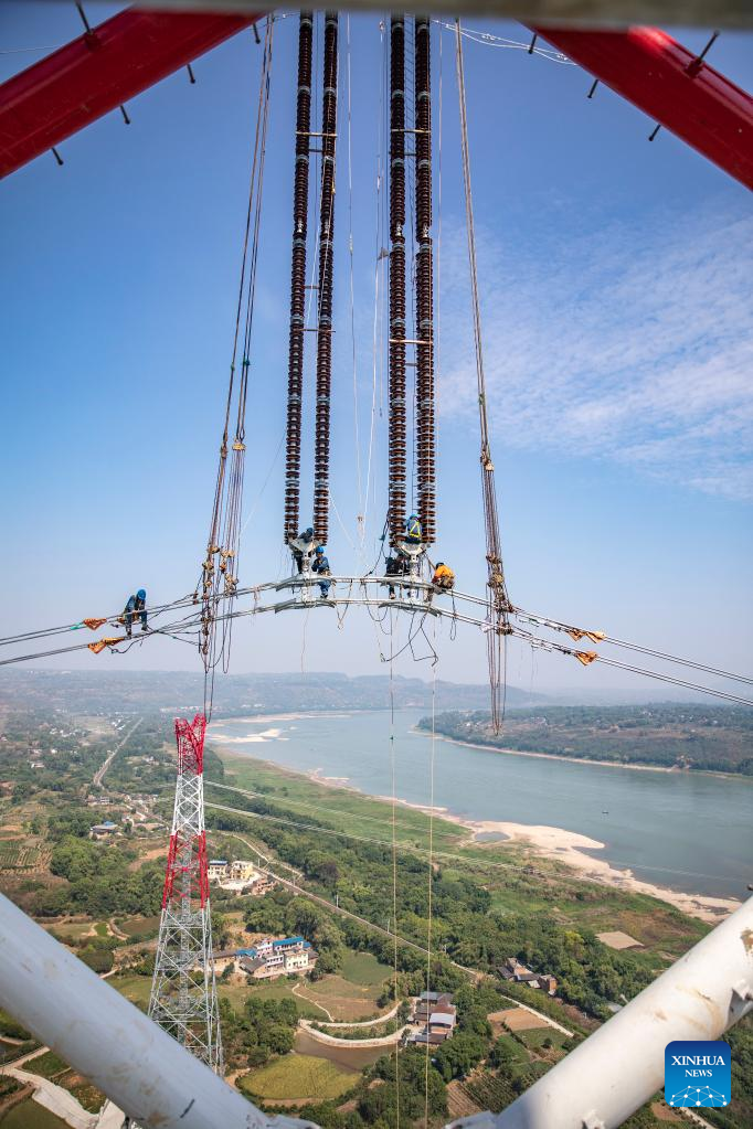 Technicians work during the cross-Yangtze River wiring operation for the Baihetan-Zhejiang 800 kv ultra-high voltage direct current (UHVDC) transmission line project (Chongqing section) in southwest China's Chongqing, Sept. 13, 2022. After a 13-day campaign, the cross-Yangtze River wiring operation for the Baihetan-Zhejiang 800 kv ultra-high voltage direct current (UHVDC) transmission line project concluded successfully on Tuesday. The 2,140-kilometer line, whose construction kicked off in October 2021, winds its way through Sichuan, Chongqing, Hubei, Anhui and Zhejiang. It is expected to be fully built by the end of September, and operational by November this year. Celebrated as one of China's "power highways," this line is also an important part of the country's west-to-east power transmission program. (Xinhua/Huang Wei)