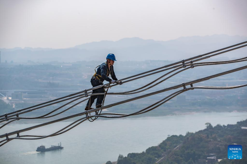 A technician works during the cross-Yangtze River wiring operation for the Baihetan-Zhejiang 800 kv ultra-high voltage direct current (UHVDC) transmission line project (Chongqing section) in southwest China's Chongqing, Sept. 13, 2022. After a 13-day campaign, the cross-Yangtze River wiring operation for the Baihetan-Zhejiang 800 kv ultra-high voltage direct current (UHVDC) transmission line project concluded successfully on Tuesday. The 2,140-kilometer line, whose construction kicked off in October 2021, winds its way through Sichuan, Chongqing, Hubei, Anhui and Zhejiang. It is expected to be fully built by the end of September, and operational by November this year. Celebrated as one of China's "power highways," this line is also an important part of the country's west-to-east power transmission program. (Xinhua/Huang Wei)