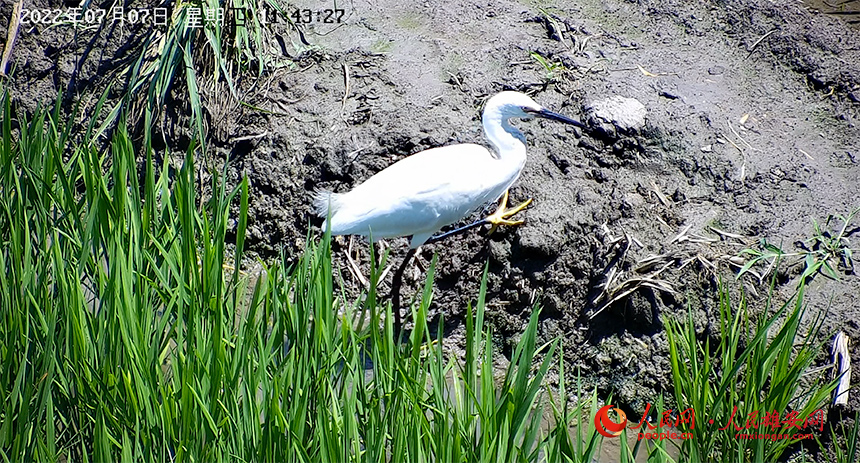 The screenshot captured from a video shows a bird at Baiyangdian Lake in Xiongan New Area, north China's Hebei Province. The wild bird monitoring and protection system in Xiongan New Area can provide high-definition monitoring, including pictures and videos of wild birds, as well as identifying species of birds and providing statistics on the number of birds monitored in the area. It also serves as a database and facilitates anti-poaching efforts in Xiongan. (Photo courtesy of China Tower)