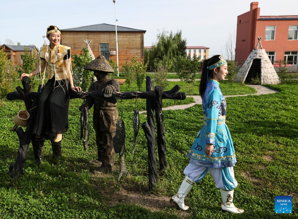Shang Meihan (1st L) performs a Hezhe dance in the Hezhe ethnic village of Zhuaji in Wusu Town of Fuyuan City, northeast China's Heilongjiang Province, Sept. 4, 2022.