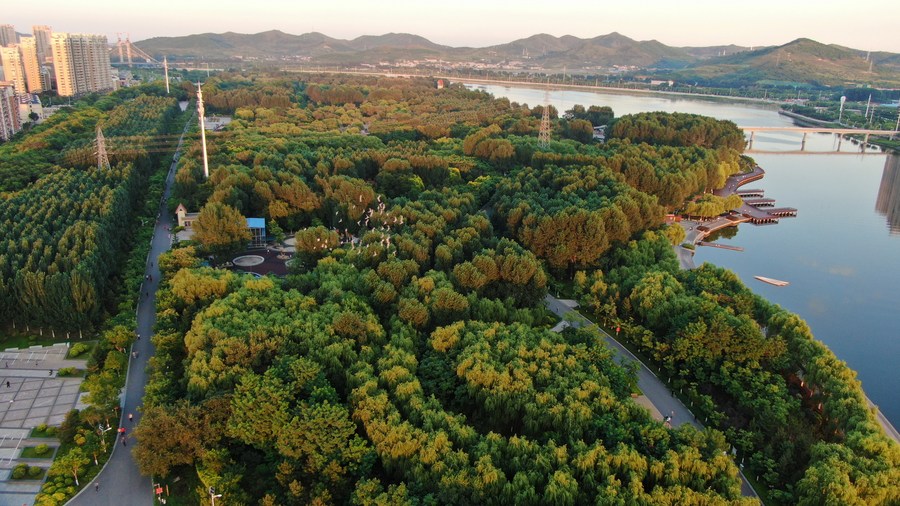 Aerial photo taken on Aug. 16, 2022 shows a view of Donghu forest park in Jinzhou, northeast China's Liaoning Province. (Xinhua/Yang Qing)