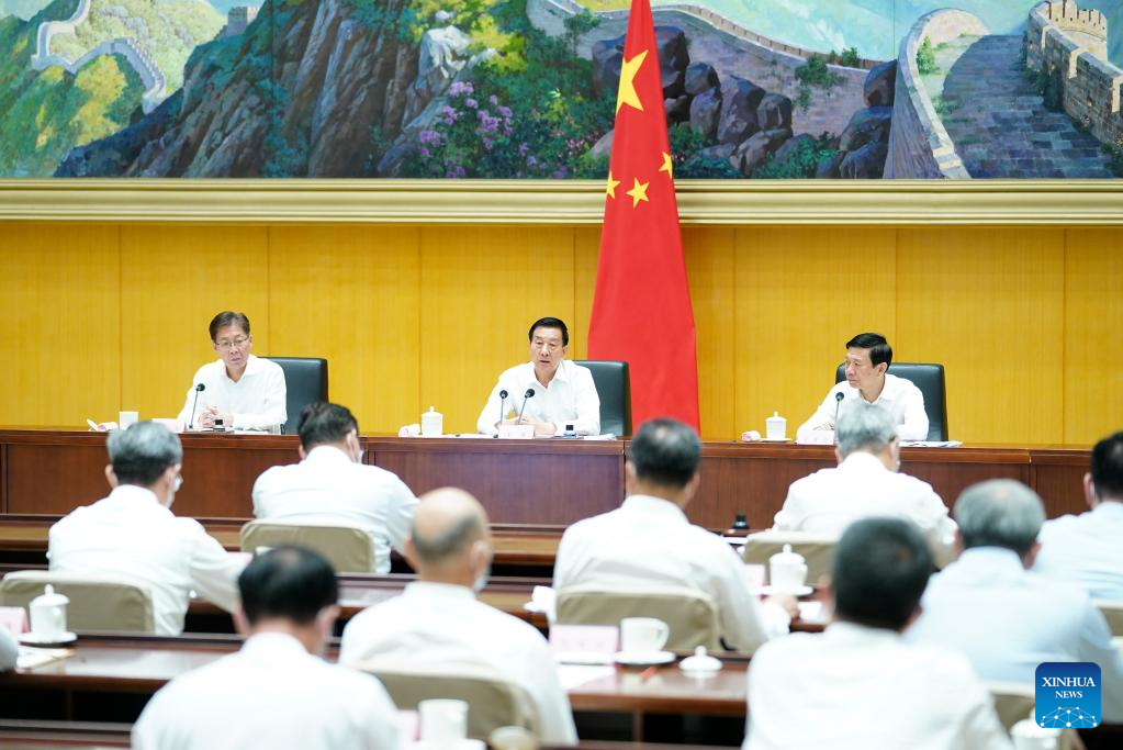 Chinese State Councilor Wang Yong, also head of the national headquarters of forest and grassland fire prevention and control, attends a national teleconference on forest and grassland fire prevention and control in Beijing, capital of China, Sept. 16, 2022. (Xinhua/Yan Yan)