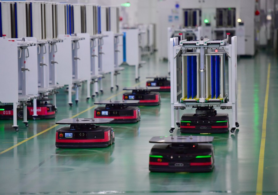 Smart robots work at a monocrystalline silicon solar cell factory of LONGi Green Energy Technology Co., Ltd. in Xi'an, northwest China's Shaanxi Province, March 25, 2022. (Xinhua/Shao Rui)