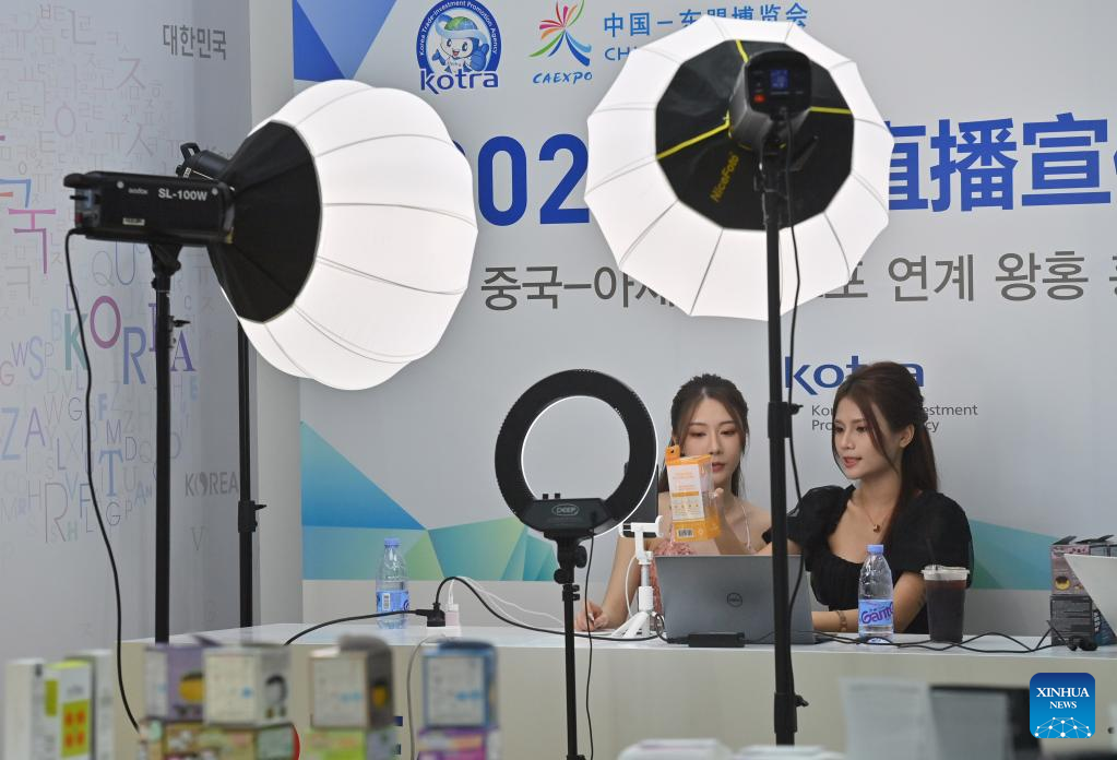 Live streamers show product in a broadcasting room at the South Korea pavilion during the 19th China-ASEAN Expo in Nanning, south China's Guangxi Zhuang Autonomous Region, Sept. 17, 2022. The four-day expo themed "Sharing RCEP New Opportunities, Building a Version 3.0 China-ASEAN Free Trade Area," will last till Monday as this year marks the first year of implementation of the Regional Comprehensive Economic Partnership (RCEP) free trade agreement. (Xinhua/Huang Xiaobang)