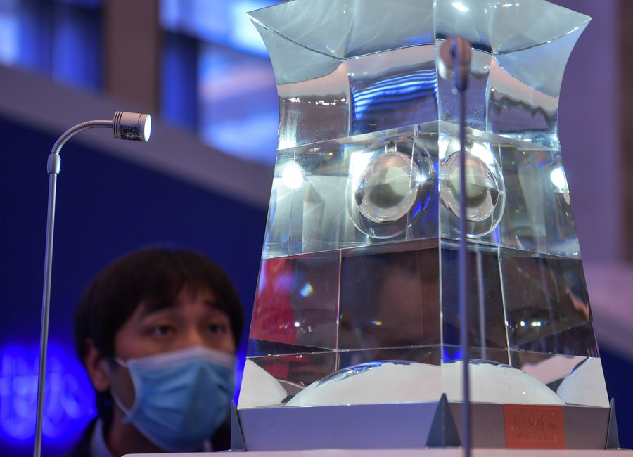 A visitor looks at lunar samples brought back by China's Chang'e-5 probe at the National Museum of China in Beijing, capital of China, April 18, 2021. (Xinhua/Yin Dongxun)