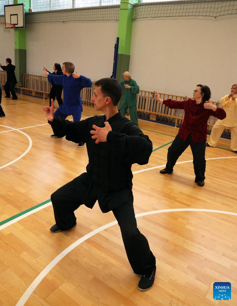 People practice Chinese Tai Chi in Vilnius, Lithuania, Sept. 18, 2022. Dozens of Tai Chi enthusiasts gathered in Vilnius on weekend to practice Tai Chi under the guidance of coach Wang Xiyin, who has been living in Lithuania for more than 30 years and is the Tai Chi coach in the past 20 years. (Photo by Yang Weihua/Xinhua)