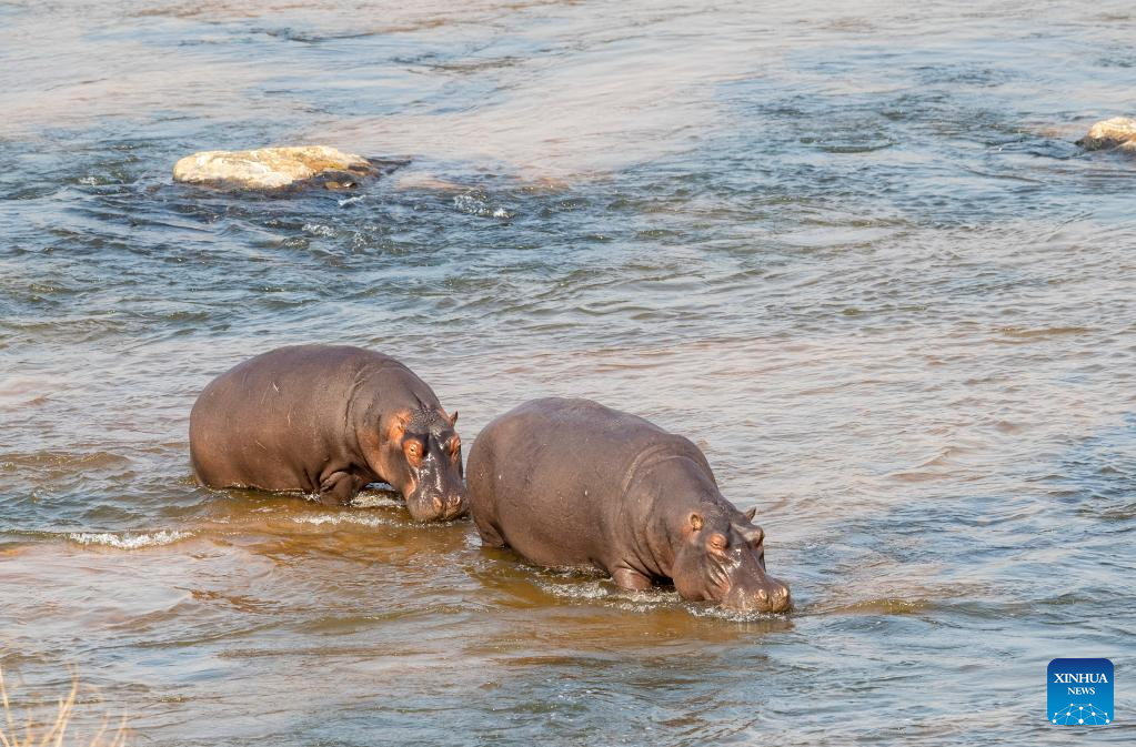 Photo taken on Sept. 18, 2022 shows hippos at the Kruger National Park, Mpumalanga, South Africa. Kruger National Park is one of the largest game reserves in Africa. Covering an area of 19,485 square kilometers in northeastern South Africa, the park is a home to an impressive number of species. (Xinhua/Zhang Yudong)