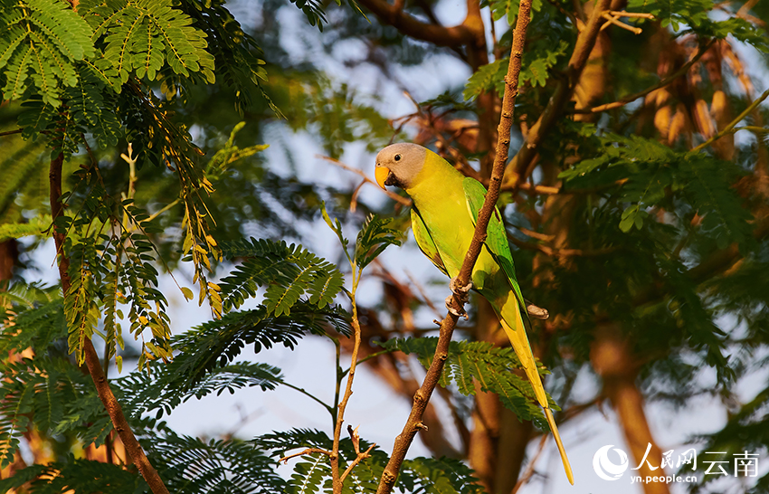 A female blossom-headed parakeet perches on a tree branch. (Photo/Xu Xiangdong)