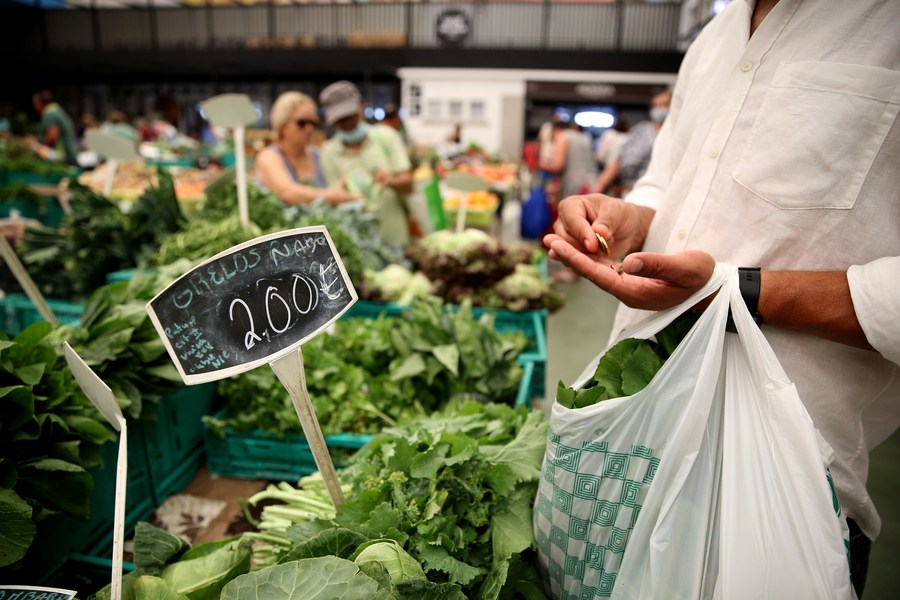 Customers shop at a market in Cascais, Portugal, on July 13, 2022. (Photo by Pedro Fiuza/Xinhua)