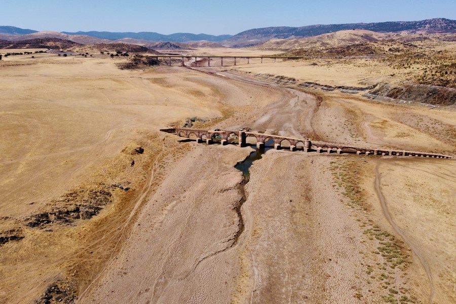 A view of Cijara reservoir in Extremadura, Spain, Aug. 15, 2022. Lack of rain has left water volumes in its reservoirs at less than 40 percent of their storage capacities -- 20 percent below the average level for this time of the year. (Xinhua/Meng Dingbo)
