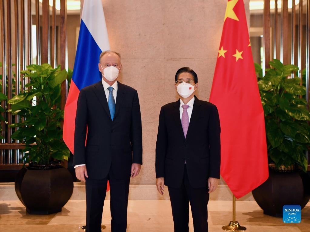 Guo Shengkun, a member of the Political Bureau of the Communist Party of China (CPC) Central Committee and Secretary of the Political and Legal Affairs Commission of the CPC Central Committee, co-chairs the 7th meeting of the China-Russia law-enforcement and security cooperation mechanism with Nikolai Patrushev, secretary of the Security Council of the Russian Federation, in southeast China's Fujian Province, Sept. 19, 2022. (Xinhua/Jiang Kehong)
