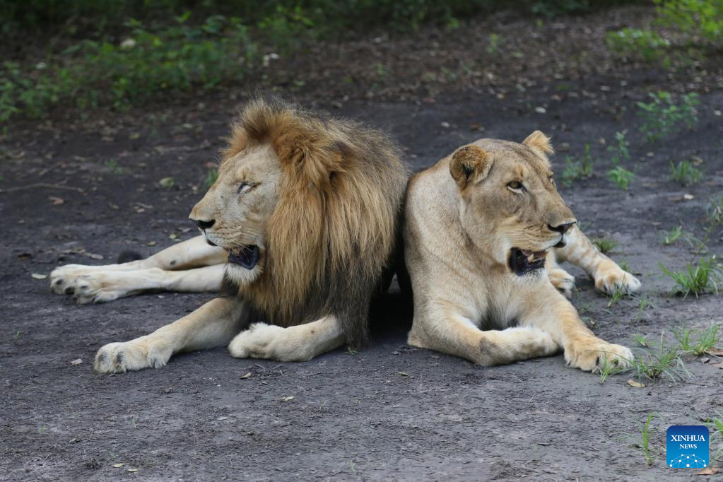 Two lions rest at a safari park in the Saloum Delta region of Senegal, Sept. 16, 2022.