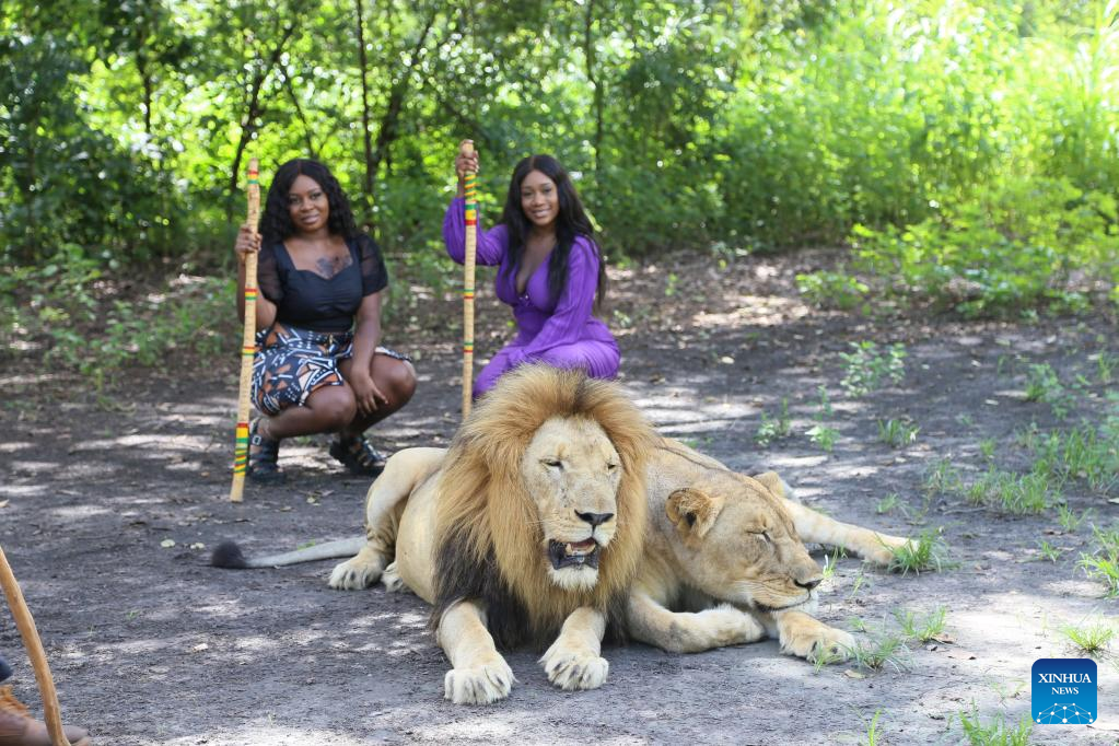 Tourists pose for photos with lions at a safari park in the Saloum Delta region of Senegal, Sept. 16, 2022.