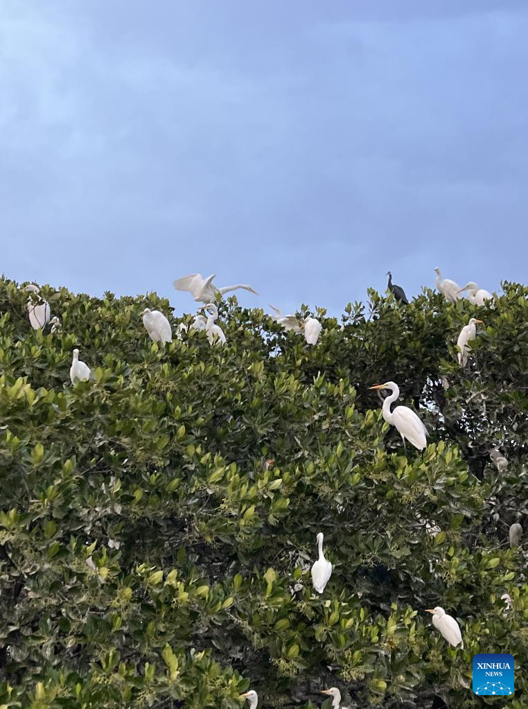 Photo taken on Jan. 16, 2022 with a mobile phone shows egrets perching on trees in the Saloum Delta region of Senegal.