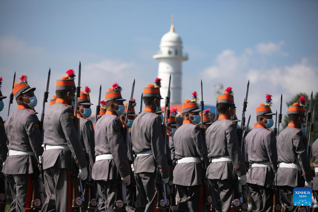 Nepali soldiers participate in the celebration of the Constitution Day in Kathmandu, Nepal, Sept. 19, 2022. (Photo by Sulav Shrestha/Xinhua)