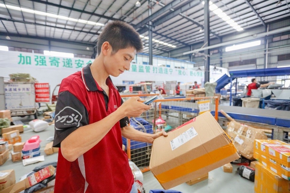 A man scans the code on an Express Parcel in a warehouse of a logistics company in Suining, southwest China's Sichuan province, September, 2020. (Photo by Liu Changsong/People's Daily Online)