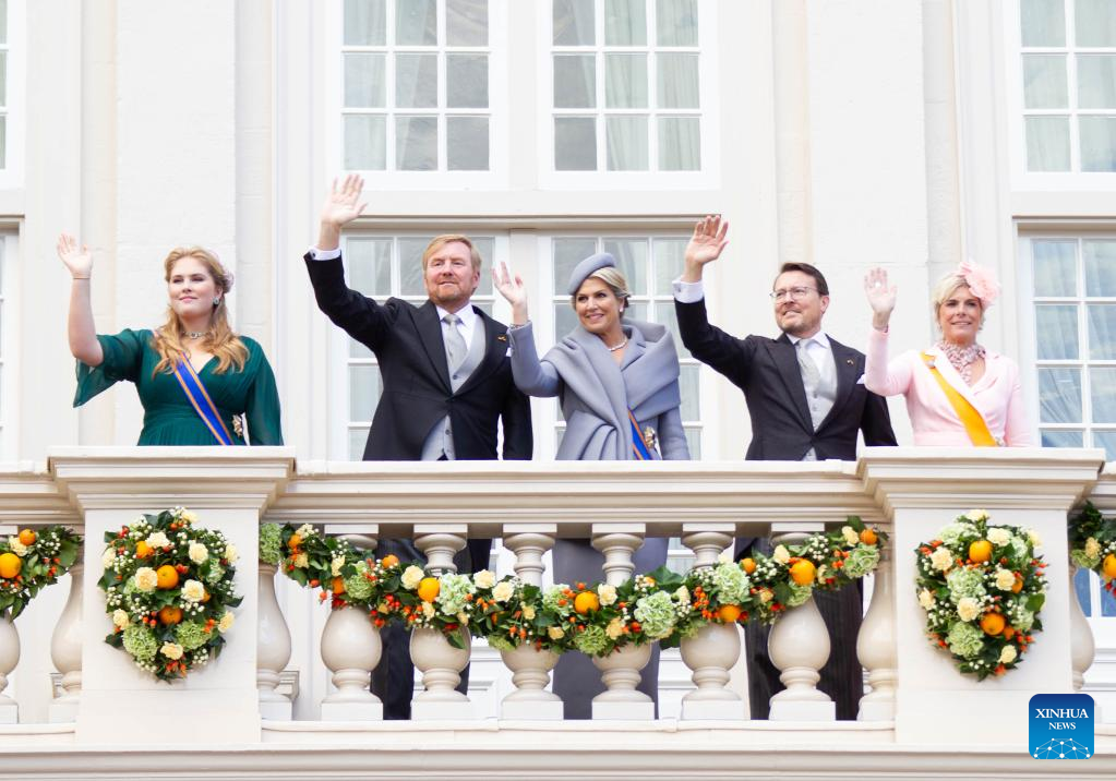 Dutch Princess Amalia, King Willem-Alexander, Queen Maxima, Prince Constantijn and Princess Laurentien (from L to R) wave to people on the Balcony of Noordeinde Palace in the Hague, the Netherlands, on the Prince's Day, Sept. 20, 2022. The third Tuesday in September is Prince's Day in the Netherlands. It marks the opening of the Dutch parliamentary season, and on this day the reigning monarch outlines the government's plans for the year ahead. (Photo by Sylvia Lederer/Xinhua)